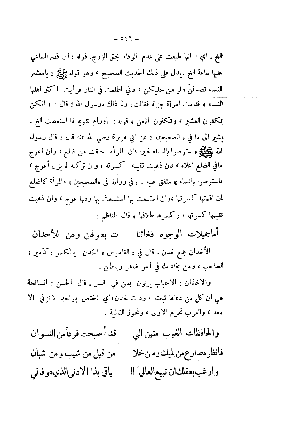 الخ أَي أَنَّهَا طبعت على عدم الْوَفَاء بِحَق الزَّوْج قَوْله إِن قصر السَّاعِي عَلَيْهَا سَاعَة الخ يدل على ذَلِك الحَدِيث الصَّحِيح وَهُوَ قَوْله صلى الله عَلَيْهِ وَسلم يَا معشر النِّسَاء تصدقن وَلَو من حليكن فَانِي اطَّلَعت فِي النَّار فَرَأَيْت أَكثر أَهلهَا النِّسَاء فَقَامَتْ امْرَأَة جزلة فَقَالَت وَلم ذَلِك يَا رَسُول الله قَالَ انكن تكفرن العشير وتكثرن اللَّعْن قَوْله أَو رام تقويما لَهَا اسْتَعْصَتْ الخ يُشِير الى مَا فِي الصَّحِيحَيْنِ عَن ابي هُرَيْرَة رَضِي الله عَنهُ قَالَ قَالَ رَسُول الله صلى الله عَلَيْهِ وَسلم اسْتَوْصُوا بِالنسَاء خيرا فان الْمَرْأَة خلقت من ضلع وان اعوج مَا فِي الضلع أَعْلَاهُ فان ذهبت تُقِيمهُ كَسرته وان تركته لم يزل أَعْوَج فَاسْتَوْصُوا بِالنسَاء مُتَّفق عَلَيْهِ وَفِي رِوَايَة فِي الصَّحِيحَيْنِ الْمَرْأَة كالضلع إِن أقمتها كسرتها وان استمعت بهَا استمتعت بهَا وفيهَا عوج وان ذهبت تقيمها كسرتها وَكسرهَا طَلاقهَا قَالَ النَّاظِم ... أما جميلات الْوُجُوه فخائنا ... ت بعولهن وَهن للأخذان ...