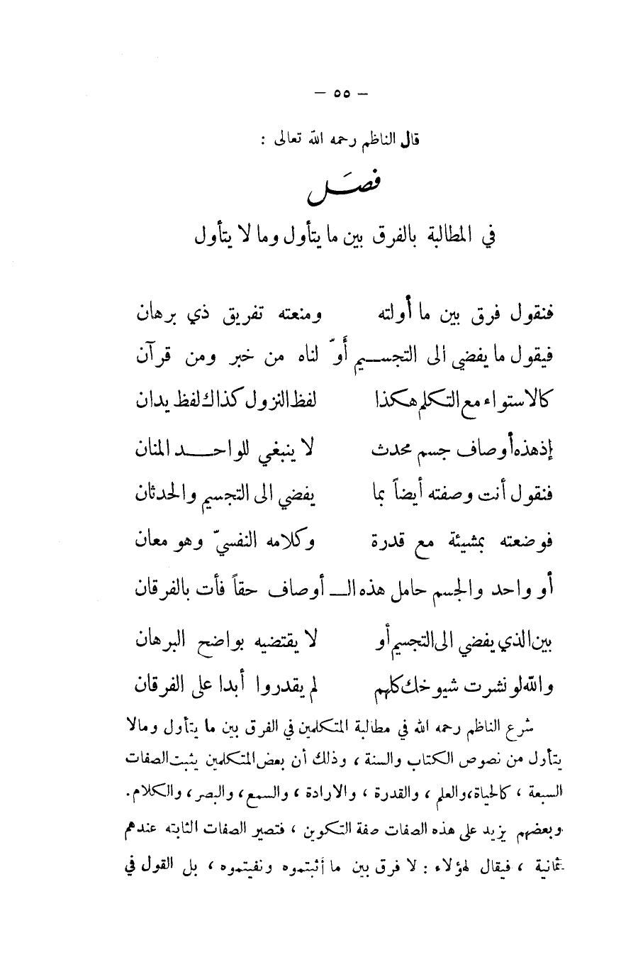 شرح النَّاظِم رَحمَه الله فِي مُطَالبَة الْمُتَكَلِّمين فِي الْفرق بَين مَا يتَأَوَّل ومالا يتَأَوَّل من نُصُوص الْكتاب وَالسّنة وَذَلِكَ أَن بعض الْمُتَكَلِّمين يثبت الصِّفَات السَّبْعَة كالحياة وَالْعلم وَالْقُدْرَة والارادة والسمع وَالْبَصَر وَالْكَلَام وَبَعْضهمْ يزِيد على هَذِه الصِّفَات صفة التكوين فَتَصِير الصِّفَات الثَّابِتَة عِنْدهم ثَمَانِيَة فَيُقَال لهَؤُلَاء لَا فرق بَين مَا أثبتموه ونفيتموه بل القَوْل فِي