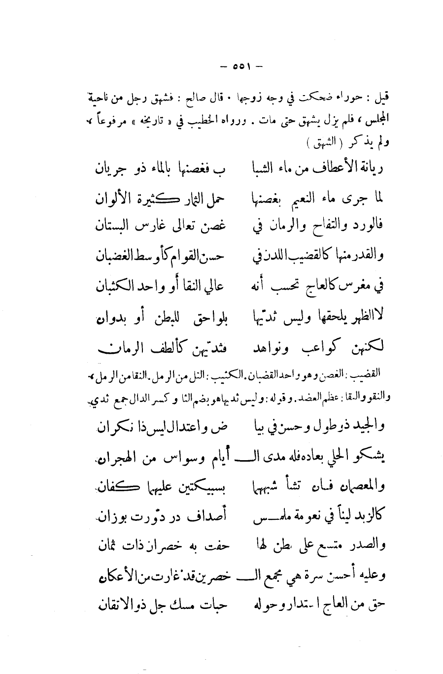 قيل حوراء ضحِكت فِي وَجه زَوجهَا قَالَ صَالح فشهق رجل من نَاحيَة الْمجْلس فَلم يزل يشهق حَتَّى مَاتَ وَرَوَاهُ الْخَطِيب فِي تَارِيخه مَرْفُوعا وَلم يذكر الشهق ... ريانة الأعطاف من مَاء الشبا ... ب فغصنها بِالْمَاءِ ذُو جَرَيَان