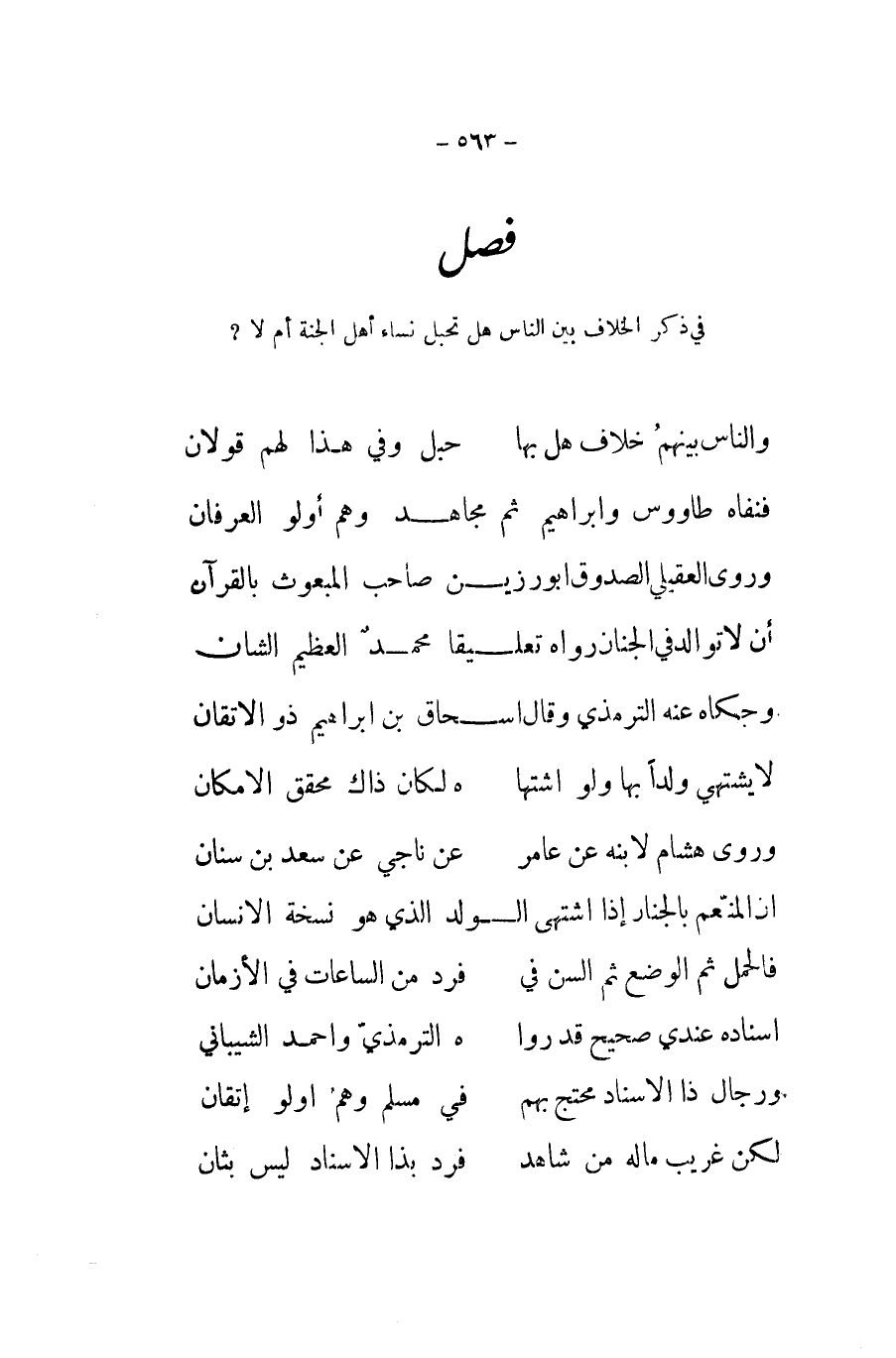 فصل فِي ذكر الْخلاف بَين النَّاس هَل تحبل نسَاء أهل الْجنَّة أم لَا ... وَالنَّاس بَينهم خلاف هَل بهَا ... حَبل وَفِي هَذَا لَهُم قَولَانِ