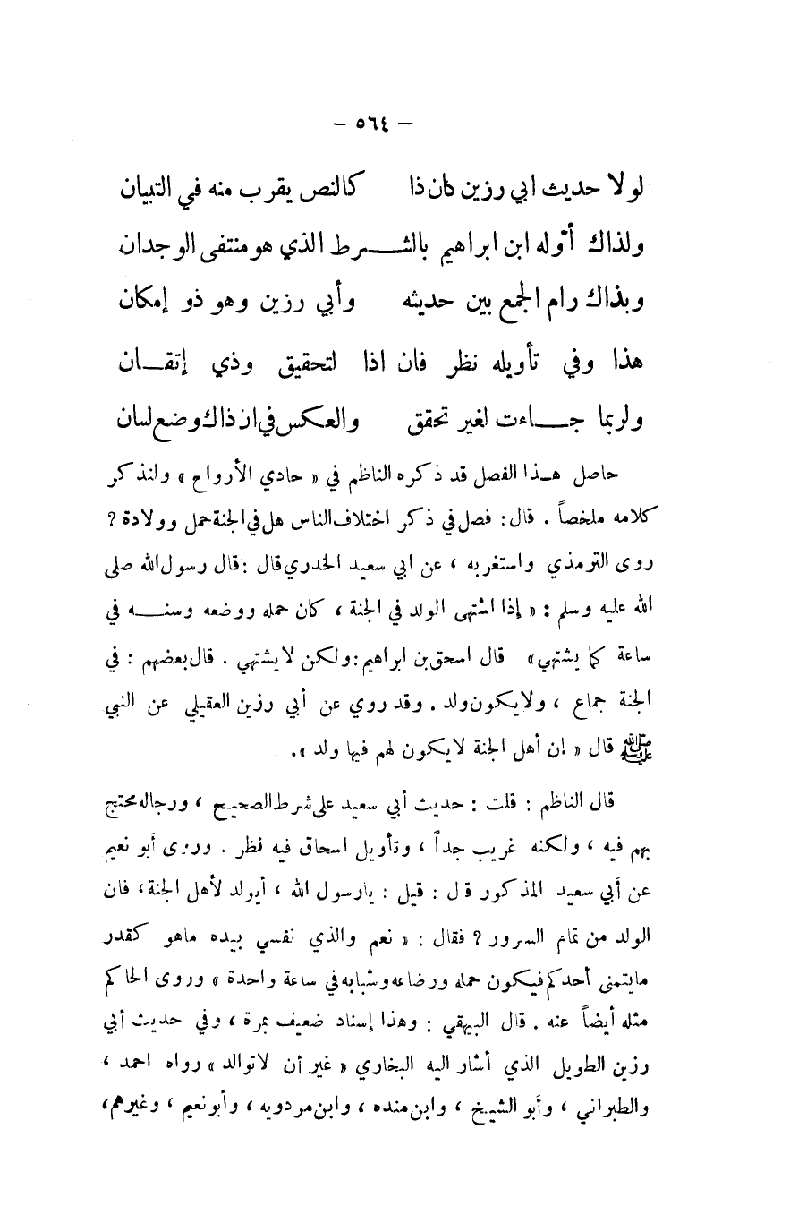 قَالَ النَّاظِم قلت حَدِيث ابي سعيد على شَرط الصَّحِيح وَرِجَاله مُحْتَج بهم فِيهِ وَلكنه غَرِيب جدا وَتَأْويل اسحاق فِيهِ نظر وروى أَبُو نعيم عَن ابي سعيد الْمَذْكُور قَالَ قيل يَا رَسُول الله أيولد لأهل الْجنَّة فان الْوَلَد من تَمام السرُور فَقَالَ نعم وَالَّذِي نَفسِي بِيَدِهِ مَا هُوَ كَقدْر مَا يتَمَنَّى أحدكُم فَيكون حمله ورضاعه وشبابه فِي سَاعَة وَاحِدَة وروى الْحَاكِم مثله أَيْضا عَنهُ قَالَ الْبَيْهَقِيّ وَهَذَا إِسْنَاد ضَعِيف بِمرَّة وَفِي حَدِيث أبي رزين الطَّوِيل الَّذِي أَشَارَ اليه البُخَارِيّ غير أَن لَا توالد رَوَاهُ احْمَد وَالطَّبَرَانِيّ وَأَبُو الشَّيْخ وَابْن مَنْدَه وَابْن مرْدَوَيْه وَأَبُو نعيم وَغَيرهم