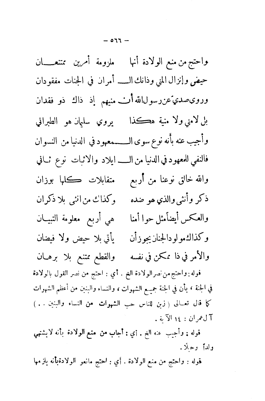 فالنفي للمعهود فِي الدُّنْيَا من الايلاد والاثبات نوع ثَانِي ... وَالله خَالق نوعنا من أَربع ... متقابلات كلهَا بوزان ... ذكر وَأُنْثَى وَالَّذِي هُوَ ضِدّه ... وَكَذَلِكَ من أُنْثَى بِلَا ذكران