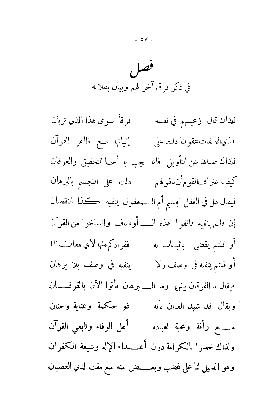 فَيُقَال هَل فِي الْعقل تجسيم ام الْمَعْقُول يَنْفِيه كَذَا النُّقْصَان ... إِن قُلْتُمْ يَنْفِيه فانفوا هَذِه ال أَوْصَاف وانسلخوا من الْقُرْآن