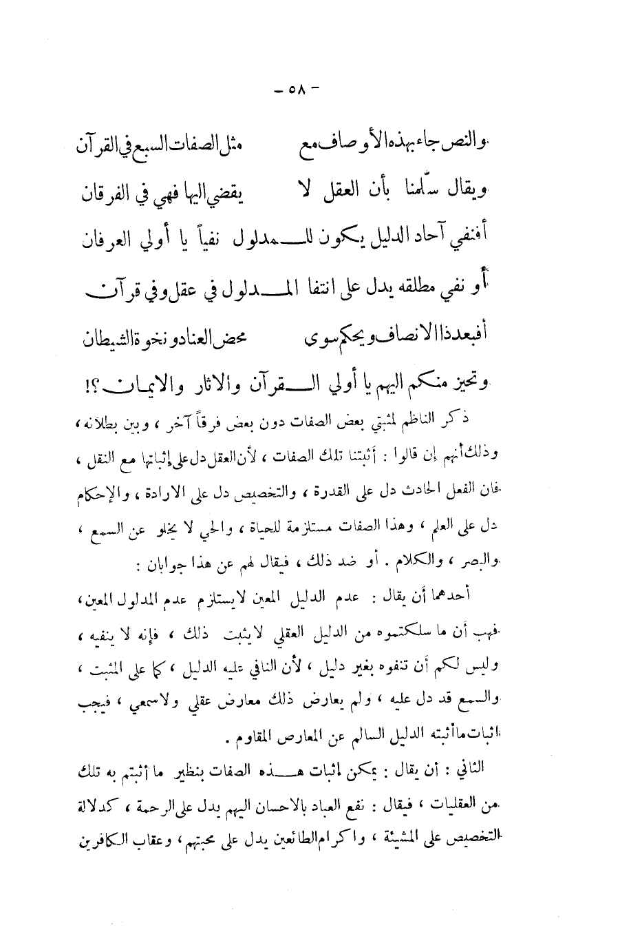ذكر النَّاظِم لمثبتي بعض الصِّفَات دون بعض فرقا آخر وَبَين بُطْلَانه وَذَلِكَ أَنهم إِن قَالُوا أثبتنا تِلْكَ الصِّفَات لِأَن الْعقل دلّ على إِثْبَاتهَا مَعَ النَّقْل فان الْفِعْل الْحَادِث دلّ على الْقُدْرَة والتخصيص دلّ على الْإِرَادَة والإحكام دلّ على الْعلم وَهَذَا الصِّفَات مستلزمة للحياة والحي لَا يَخْلُو عَن السّمع وَالْبَصَر وَالْكَلَام اَوْ ضد ذَلِك لَهُم عَن هَذَا جوابان