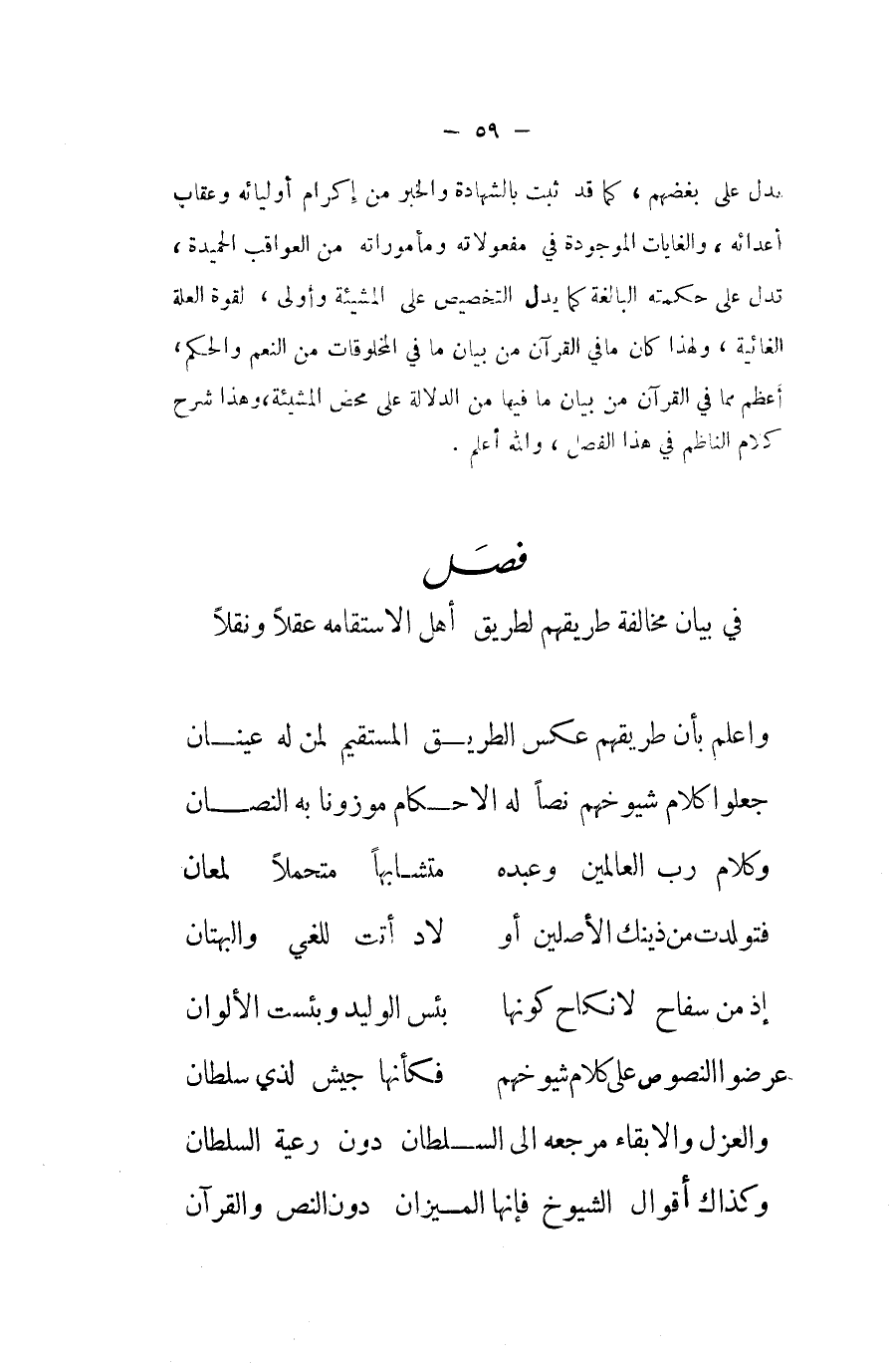جعلُوا كَلَام شيوخهم نصا لَهُ الاحكام مَوْزُونا بِهِ النصان ... وَكَلَام رب الْعَالمين وَعَبده ... متشابها متحملا لمعان ... فتولدت من ذَيْنك الْأَصْلَيْنِ أَو ... لاد أَتَت للغي والبهتان