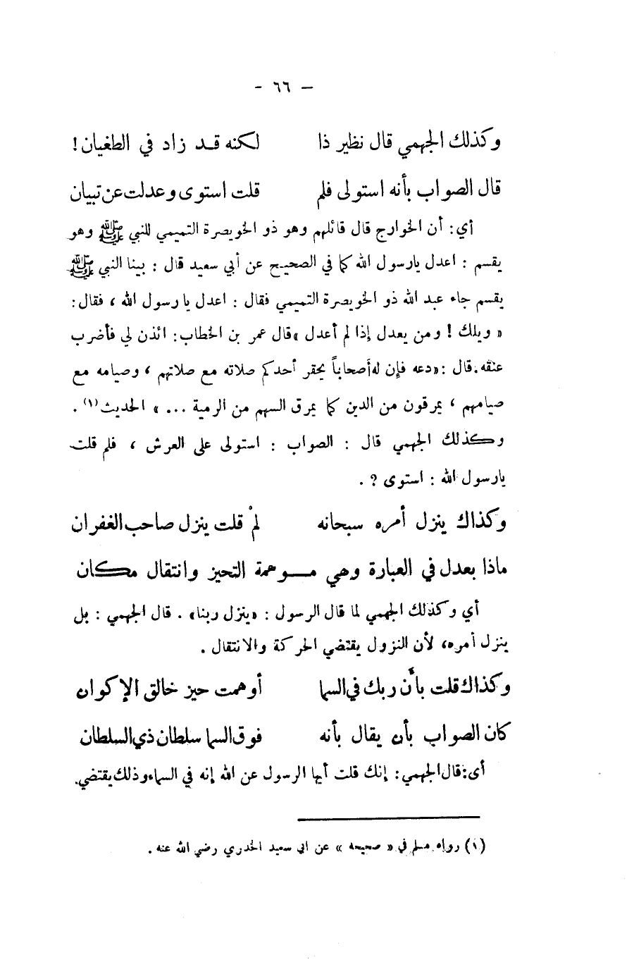 أَي ان الْخَوَارِج قَالَ قَائِلهمْ وَهُوَ ذُو الْخوَيْصِرَة التَّمِيمِي للنَّبِي صلى الله عَلَيْهِ وَسلم وَهُوَ يقسم اعْدِلْ يَا رَسُول الله كَمَا فِي الصَّحِيح عَن ابي سعيد قَالَ بَينا النَّبِي صلى الله عَلَيْهِ وَسلم يقسم جَاءَ عبد الله ذُو الْخوَيْصِرَة التَّمِيمِي فَقَالَ اعْدِلْ يَا رَسُول الله فَقَالَ وَيلك وَمن يعدل إِذا لم أعدل قَالَ عمر بن الْخطاب ائْذَنْ لي فَأَضْرب عُنُقه قَالَ دَعه فَإِن لَهُ أصحابا يحقر أحدكُم صلَاته مَعَ صلَاتهم وصيامه مَعَ صِيَامهمْ يَمْرُقُونَ من الدّين كَمَا يَمْرُق السهْم من الرَّمية الحَدِيث وَكَذَلِكَ الجهمي قَالَ الصَّوَاب استولى على الْعَرْش فَلم قلت يَا رَسُول الله اسْتَوَى ... وكذاك ينزل أمره سُبْحَانَهُ ... لم قلت ينزل صَاحب الغفران