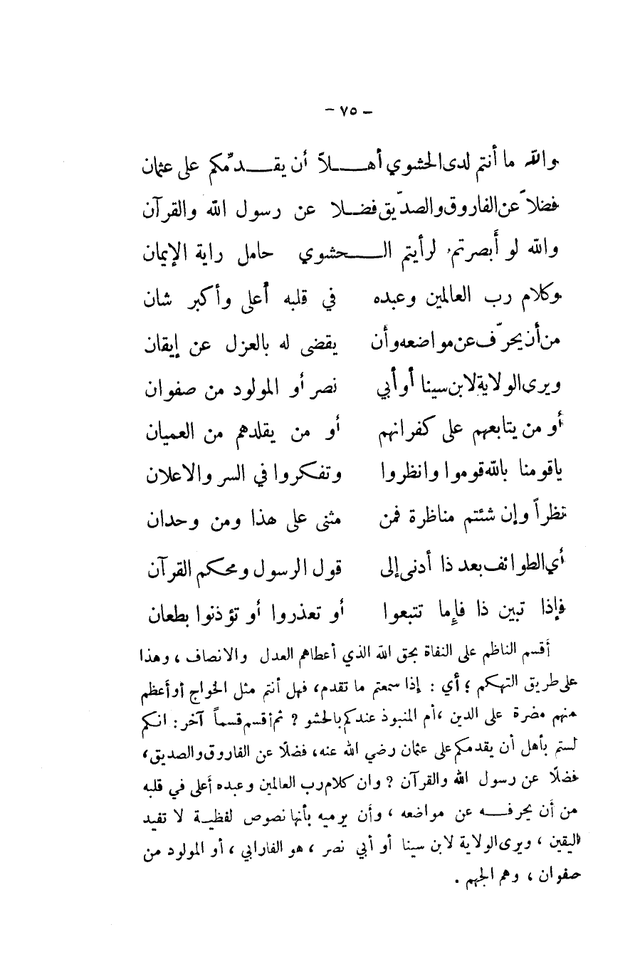 اقْسمْ النَّاظِم على النفاة بِحَق الله الَّذِي اعطاهم الْعدْل والانصاف وَهَذَا على طَرِيق التهكم أَي إِذا سَمِعْتُمْ مَا تقدم فَهَل انتم مثل الخواج اَوْ اعظم مِنْهُم مضرَّة على الدّين ام المنبوذ عنْدكُمْ بالحشو ثمَّ اقْسمْ قسما آخر انكم لَسْتُم بَاهل ان يقدمكم على عُثْمَان رَضِي الله عَنهُ فضلا عَن الْفَارُوق وَالصديق فضلا عَن رَسُول الله وَالْقُرْآن وان كَلَام رب الْعَالمين وَعَبده اعلى فِي قلبه من ان يحرفه عَن موَاضعه وان يرميه بانها نُصُوص لفظية لَا تفِيد الْيَقِين وَيرى الْولَايَة لِابْنِ سينا اَوْ ابي نصر هُوَ الفارابي اَوْ الْمَوْلُود من صَفْوَان وهم الجهم