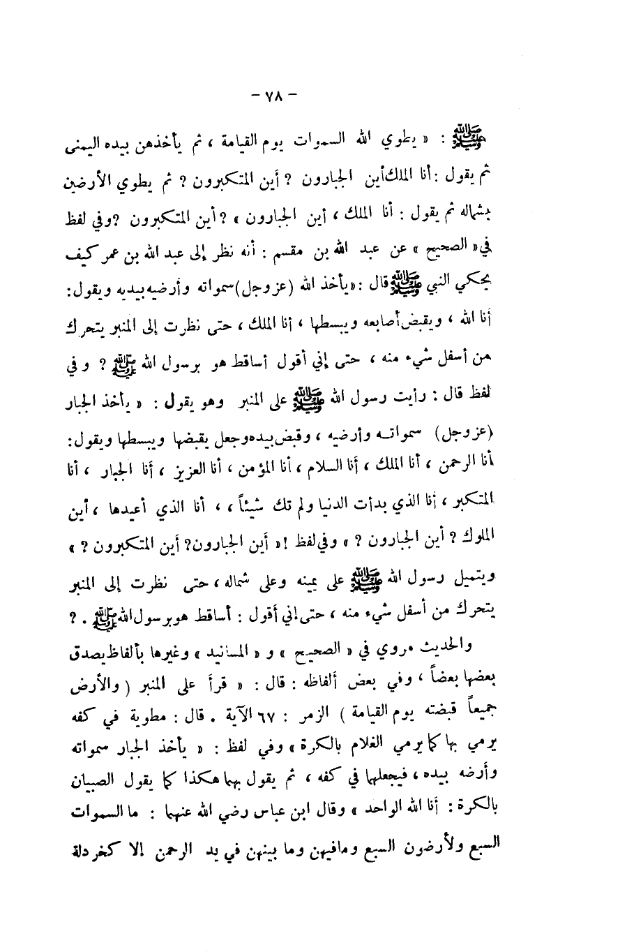 صلى الله عَلَيْهِ وَسلم يطوي الله السَّمَاوَات يَوْم الْقِيَامَة ثمَّ يأخذهن بِيَدِهِ الْيُمْنَى ثمَّ يَقُول أَنا الْملك أَيْن الجبارون ايْنَ المتكبرون ثمَّ يطوي الْأَرْضين بِشمَالِهِ ثمَّ يَقُول انا الْملك أَيْن الجبارون ايْنَ المتكبرون وَفِي لفظ فِي الصَّحِيح عَن عبد الله بن مقسم انه نظر إِلَى عبد الله بن عمر كَيفَ يَحْكِي النَّبِي صلى الله عَلَيْهِ وَسلم قَالَ يَأْخُذ الله عز وَجل سماواته وأرضيه بيدَيْهِ وَيَقُول انا الله وَيقبض أَصَابِعه ويبسطها انا الْملك حَتَّى نظرت إِلَى الْمِنْبَر يَتَحَرَّك من اسفل شَيْء مِنْهُ حَتَّى إِنِّي أَقُول أساقط هُوَ برَسُول الله صلى الله عَلَيْهِ وَسلم وَفِي لفظ قَالَ رَأَيْت رَسُول الله صلى الله عَلَيْهِ وَسلم على الْمِنْبَر وَهُوَ يَقُول يَأْخُذ الْجَبَّار عز وَجل سماواته وأرضيه وَقبض بِيَدِهِ وَجعل يقبضهَا ويبسطها وَيَقُول انا الرَّحْمَن انا الْملك انا السَّلَام انا الْمُؤمن انا الْعَزِيز انا الْجَبَّار انا المتكبر انا الَّذِي بدأت الدُّنْيَا وَلم تَكُ شَيْئا انا الَّذِي أعيدها ايْنَ الْمُلُوك ايْنَ الجبارون وَفِي لفظ أَيْن الجبارون ايْنَ المتكبرون ويتميل رَسُول الله صلى الله عَلَيْهِ وَسلم على يَمِينه وعَلى شِمَاله حَتَّى نظرت إِلَى الْمِنْبَر يَتَحَرَّك من اسفل شَيْء مِنْهُ حَتَّى إِنِّي أَقُول أساقط هُوَ برَسُول الله صلى الله عَلَيْهِ وَسلم