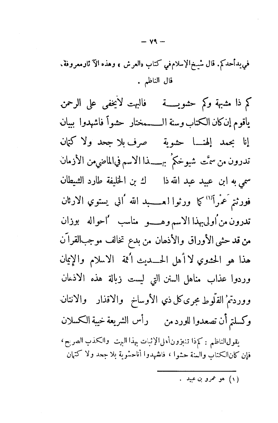 من قد حشى الأوراق والأذهان من بدع تخَالف مُوجب الْقُرْآن ... هَذَا هُوَ الحشوي لَا أهل الحَدِيث أَئِمَّة الاسلام وَالْإِيمَان