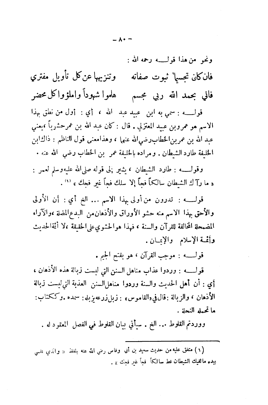 قَوْله سمي بِهِ ابْن عبيد عبد الله أَي اول من نطق بِهَذَا الِاسْم هُوَ عَمْرو بن عبيد المعتزلي قَالَ كَانَ عبد الله بن عمر حشويا يَعْنِي عبد الله بن عمر بن الْخطاب رَضِي الله عَنْهُمَا وَهَذَا معنى قَول النَّاظِم ذَاك ابْن الْخَلِيفَة طارد الشَّيْطَان وَمرَاده بالخليفة عمر بن الْخطاب رَضِي الله عَنهُ