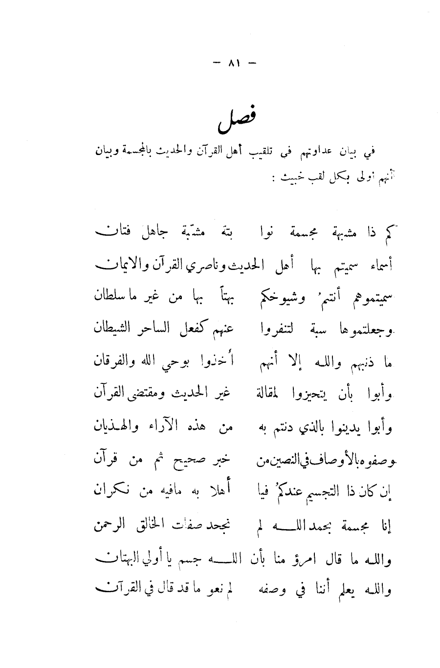أَسمَاء سميتم بهَا أهل الحَدِيث وناصري الْقُرْآن والايمان ... سميتموهم أَنْتُم وشيوخكم ... بهتا بهَا من غير مَا سُلْطَان ... وجعلتموها سبة لتنفروا ... عَنْهُم كَفعل السَّاحر الشَّيْطَان