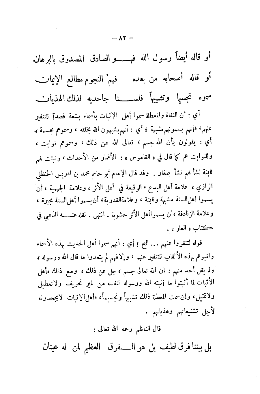 قَوْله لتنفروا عَنْهُم الخ أَي انهم سموا اهل الحَدِيث بِهَذِهِ الْأَسْمَاء ولقبوهم بِهَذِهِ الألقاب للتنفير عَنْهُم وَإِلَّا فهم لم يتعدوا مَا قَالَ الله وَرَسُوله وَلم يقل اُحْدُ مِنْهُم إِن الله تَعَالَى جسم جلّ عَن ذَلِك وَمَعَ ذَلِك فَأهل الْأَثْبَات لما أثبتوا مَا أثْبته الله وَرَسُوله لنَفسِهِ من غير تَحْرِيف وَلَا تَعْطِيل وَلَا تَمْثِيل وَإِن سمت المعطلة ذَلِك تَشْبِيها وتجسيما فَأهل الْإِثْبَات لَا يجحدونه لأجل تشنيعاتهم وهذيانهم