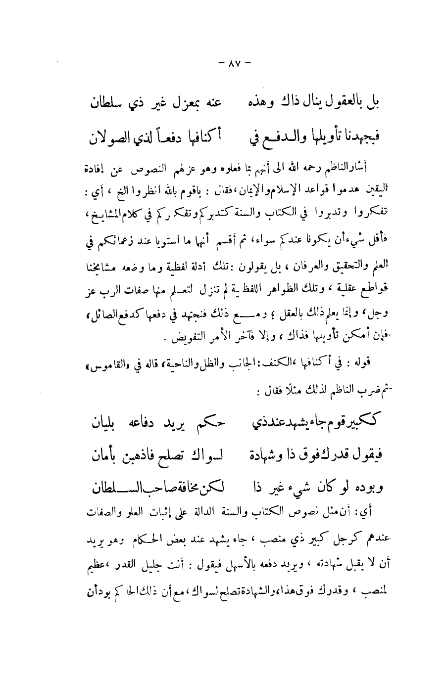 .. بل بالعقول ينَال ذَاك وَهَذِه ... عَنهُ بمعزل غير ذِي سُلْطَان ... فبجهدنا تَأْوِيلهَا وَالدَّفْع فِي ... أكنافها دفعا لذِي الصولان ...