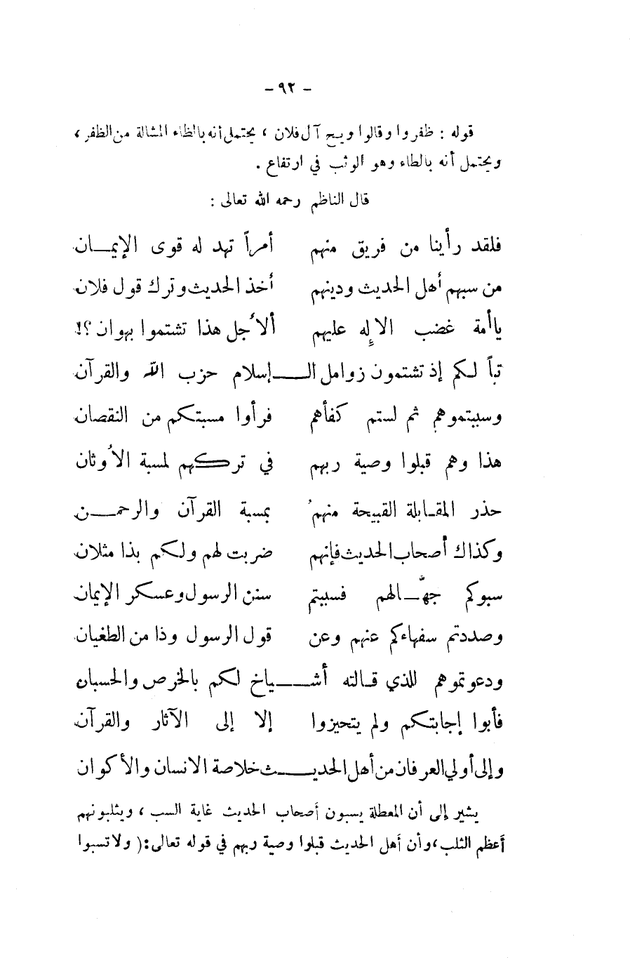 ودعوتموهم للَّذي قالته أَشْيَاخ لكم بالخرص والحسبان ... فَأَبَوا إجابتكم وَلم يتحيزوا ... إِلَّا إِلَى الْآثَار وَالْقُرْآن ... وَإِلَى أولي الْعرْفَان من أهل الحَدِيث خُلَاصَة الانسان والأكوان ...