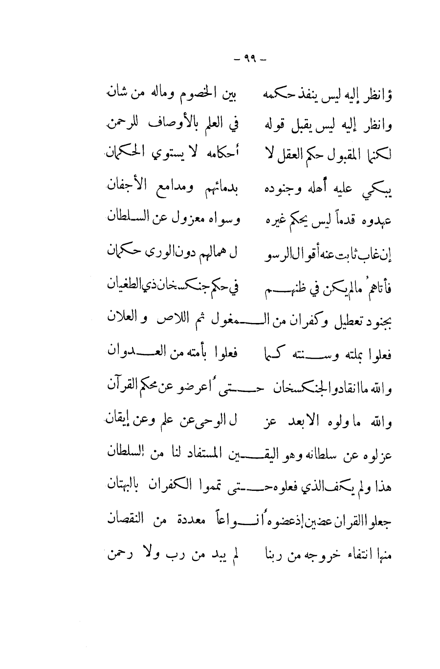 فعلوا بملته وسنته كَمَا ... فعلوا بأمته من الْعدوان ... وَالله مَا أنقادوا لجنكسخان حَتَّى أَعرضُوا عَن مُحكم الْقُرْآن ... وَالله مَا ولوه إِلَّا بعد عز ... ل الوحى عَن علم وَعَن إيقان ... عزلوه عَن سُلْطَانه وَهُوَ الْيَقِين الْمُسْتَفَاد لنا من السُّلْطَان