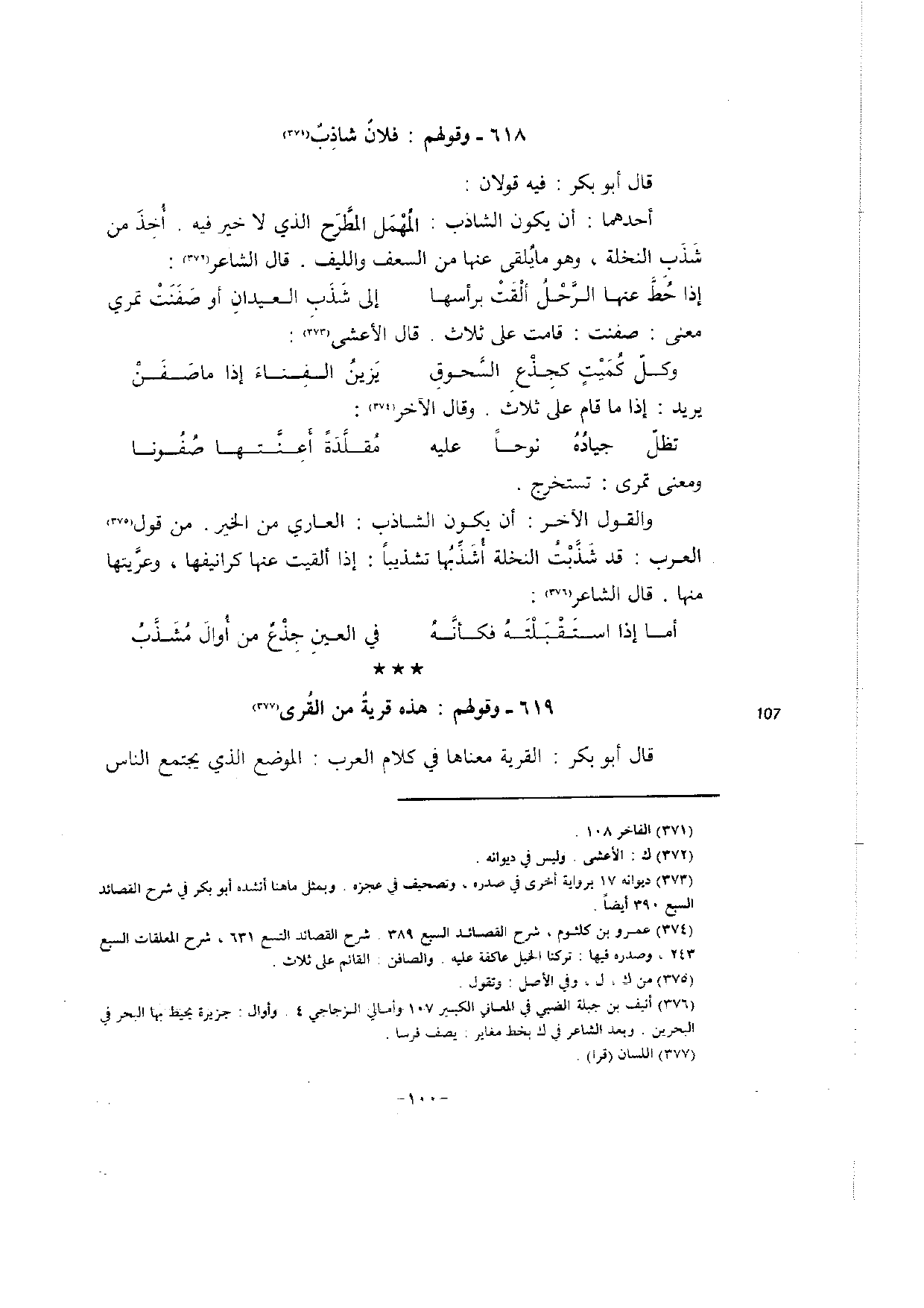 (أما إذا استَقْبَلْتَهُ فكأنَّهُ ... في العينِ جِذْعٌ من أُوالَ مُشَذَّبُ) (107)