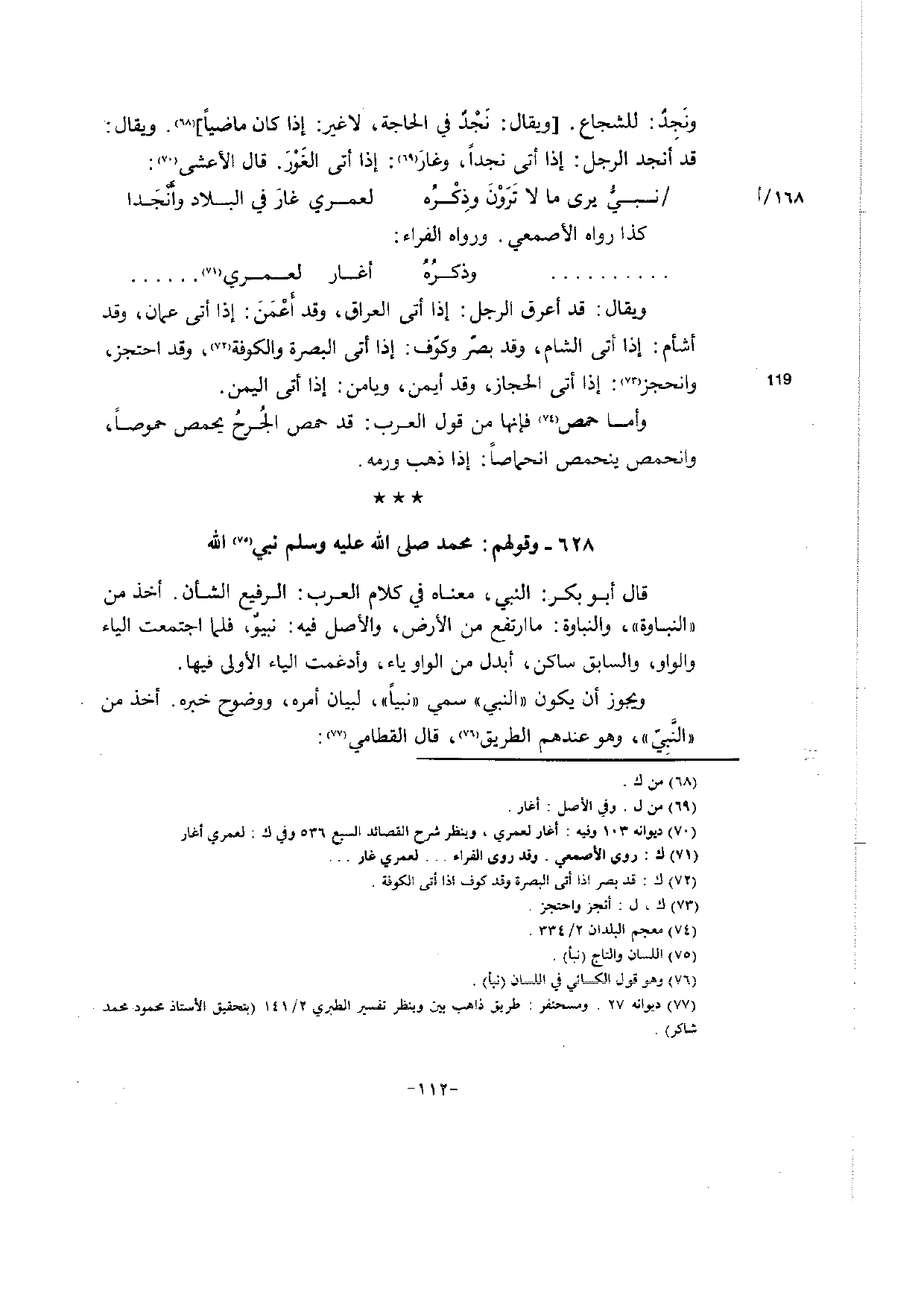 ويجوز أن يكون " النبي " سمي " نبياً " لبيان أمره، ووضوح خبره. أخذ من " النَّبِيّ "، وهو عندهم الطريق (76) ، قال القطامي (77) :