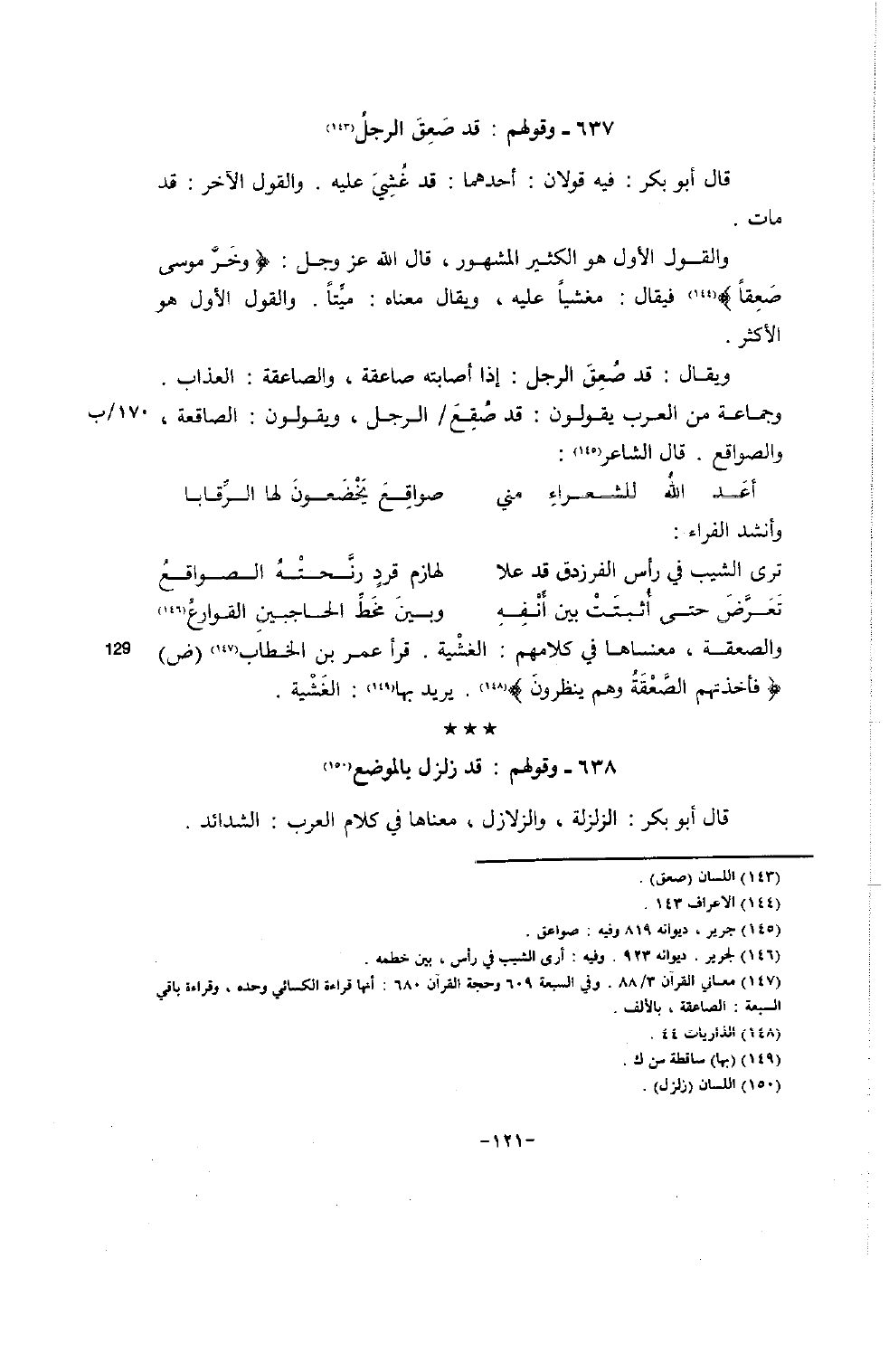 (147) معاني القرآن 3 / 88. وفي السبعة 609 وحجة القرآن 680: أنها قراءة الكسائي وحده، وقراءة باقي السبعة: الصاعقة، بالألف.