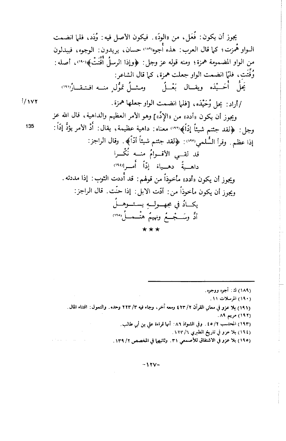 يجوز أن يكون: فُعَل، من " الودّ ". فيكون الأصل فيه: وُدَد، فلما انضمت الواو هُمزت؛ كما قال العرب: هذه أُجوه (189) حسان، يريدون: الوجوه، فيبدلون من الواو المضمومة همزة؛ ومنه قوله عز وجل: {وإذا الرسلُ أُقِّتَتْ} (190) ، أصله: وُقِّتَتِ، فلمّا انضمت الواو جعلت همزة، كما قال الشاعر: