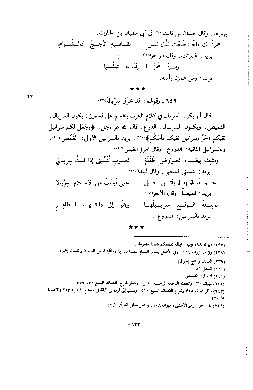 قال أبو بكر: السربال في كلام العرب ينقسم على قسمين: يكون السربال: القميص، ويكون السربال: الدرع. قال الله عز وجل: {وجَعَلَ لكم سرابيلَ تقيكم الحرَّ وسرابيلَ تقيكم بأسَكُم} (240) . يريد بالسرابيل الأولى: القُمُص (241) ، وبالسرابيل الثانية: الدروع. وقال امرؤ القيس (242) :