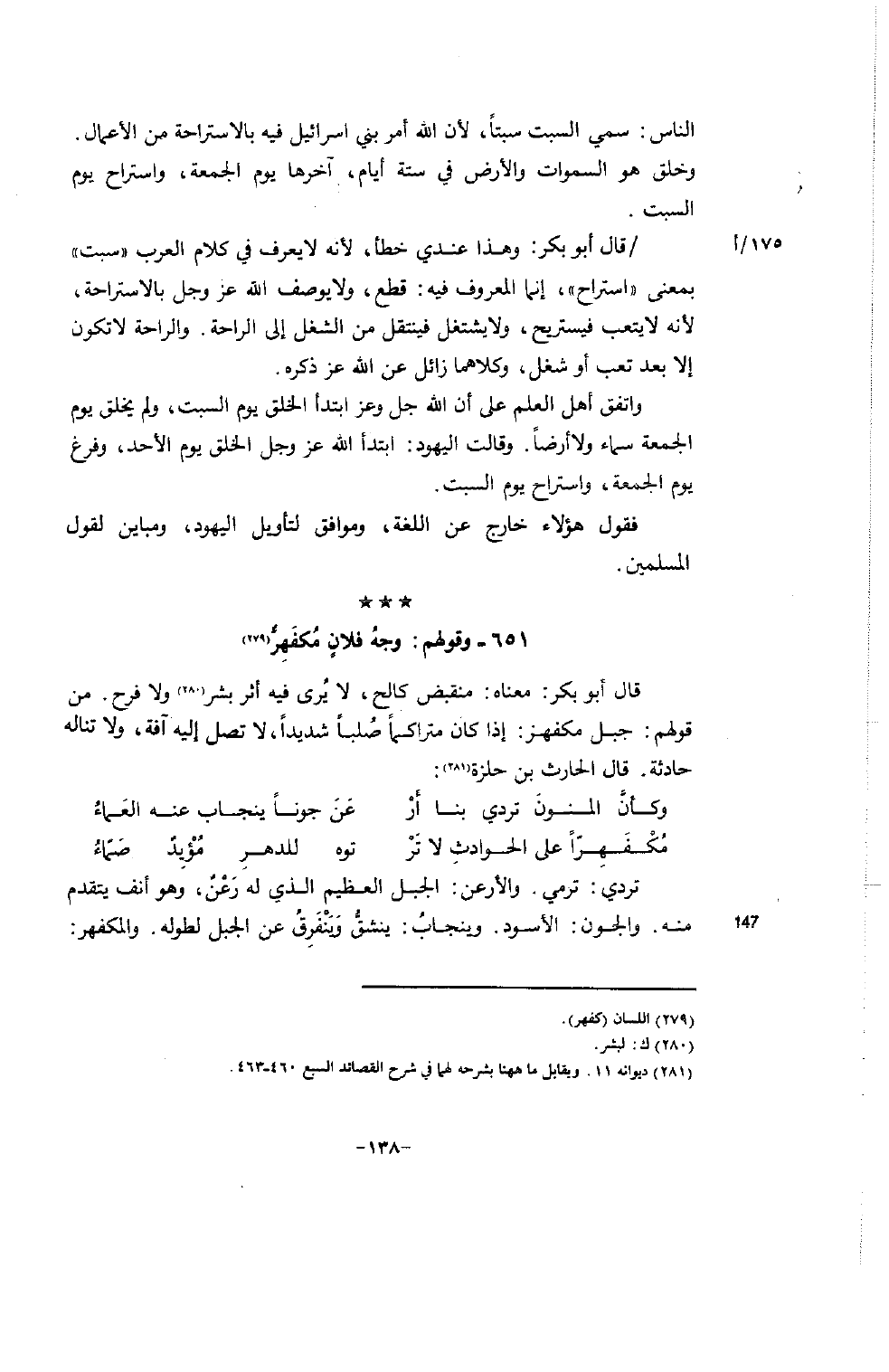 الناس: سمي السبت سبتاً، لأن الله أمر بني إسرائيل فيه بالاستراحة من الأعمال. وخلق هو السموات والأرض في ستة أيام، آخرها يوم الجمعة، واستراح يوم السبت. / 175 / أ /