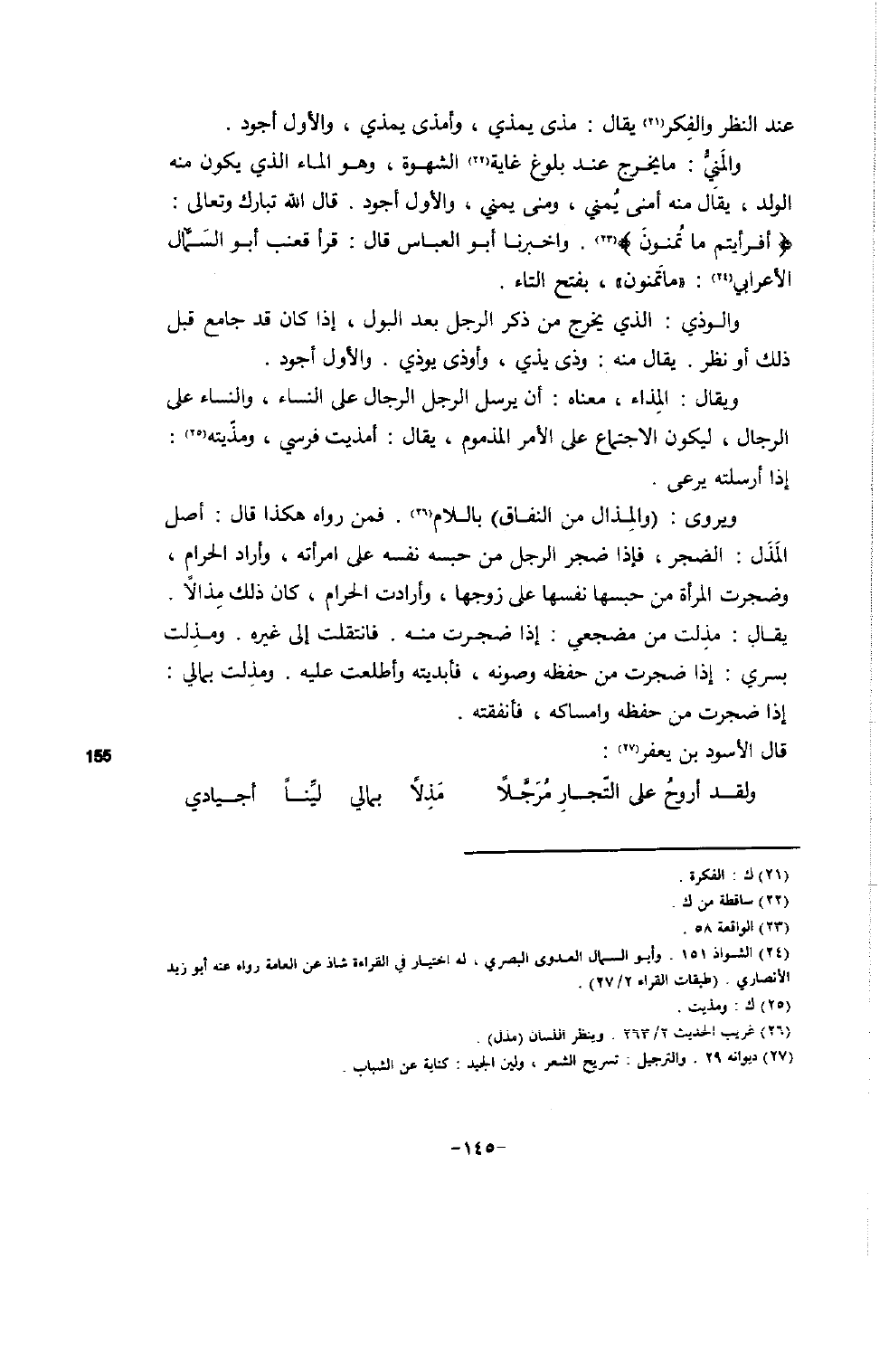 ويروى: (والمِذال من النفاق) باللام (26) . فمن رواه هكذا قال: أصل المَذَل: الضجر، فإذا ضجر الرجل من حبسه نفسه على امرأته، وأراد الحرام، وضجرت المرأة من حبسها نفسها على زوجها، وأرادت الحرام، كان ذلك مِذالاً. يقال: مذِلت من مضجعي: إذا ضجرت منه. فانتقلت إلى غيره. ومذِلت بسري: إذا ضجرت من حفظه وصونه، فأبديته وأطلعت عليه. ومذِلت بمالي: إذا ضجرت من حفظه وإمساكه، فأنفقته. قال الأسود بن يعفر (27) : (155)