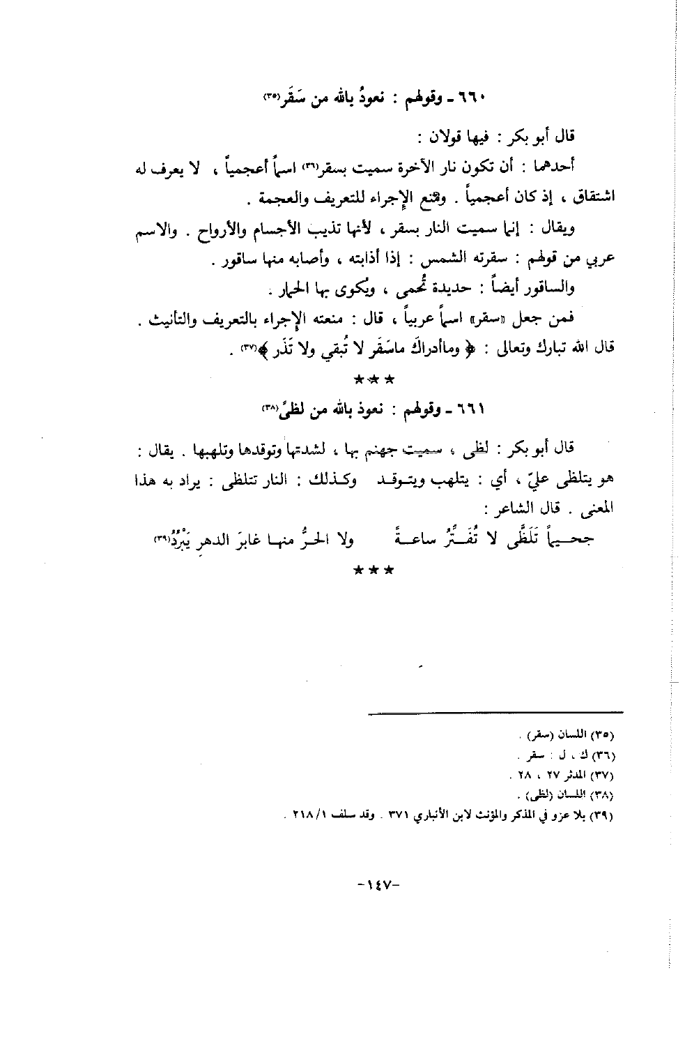 فمن جعل " سقر " اسماً عربياً، قال: منعته الإجراء بالتعريف والتأنيث. قال الله تبارك وتعالى: {وما أدراك ما سَقَر لا تُبقي ولا تَذَر} (37) .