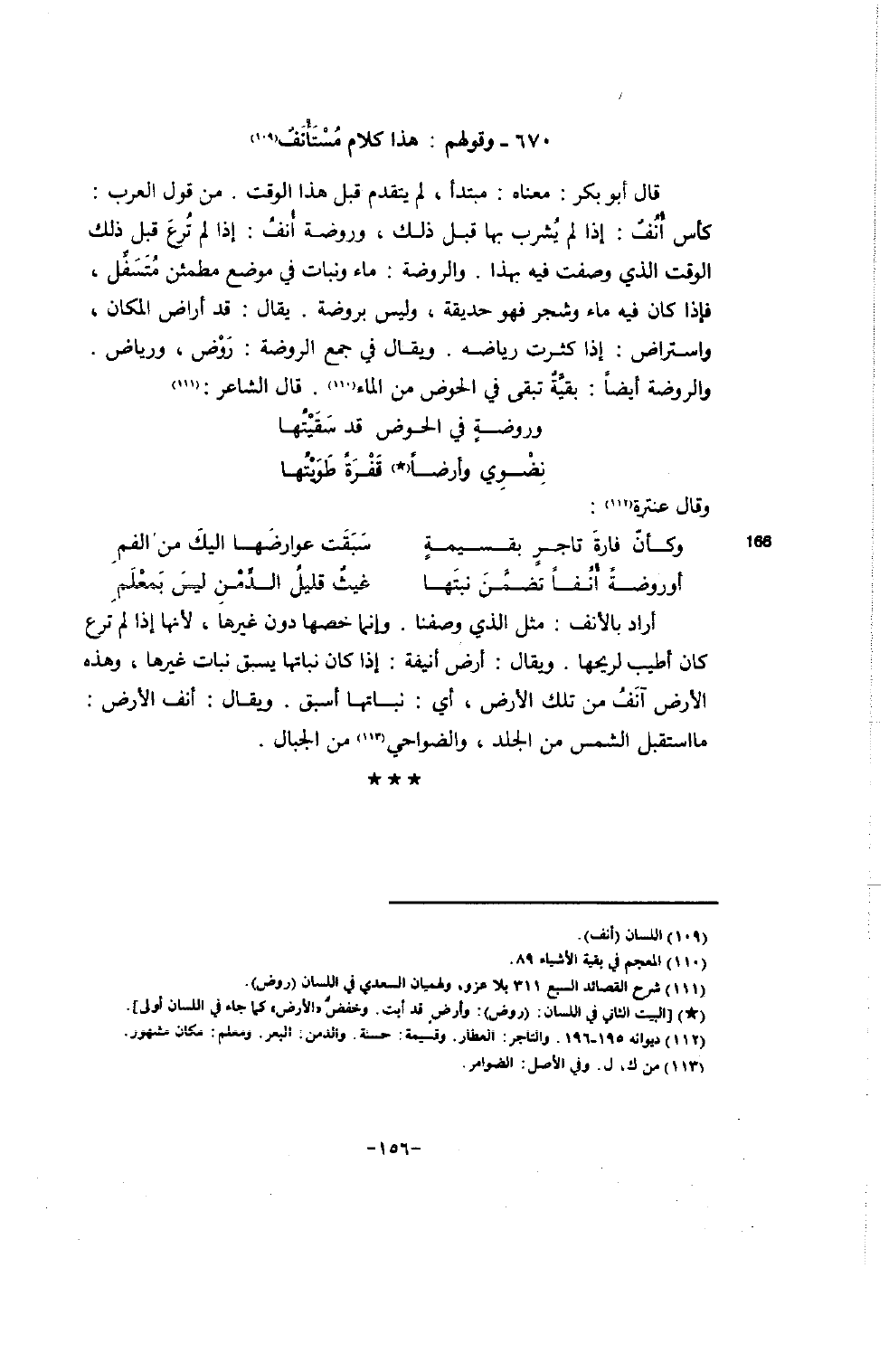 قال أبو بكر: معناه: مبتدأ، لم يتقدم قبل هذا الوقت. من قول العرب: كأس أُنُفٌ: إذا لم يُشرب بها قبل ذلك، وروضة أُنفُ: إذا لم تُرع قبل ذلك الوقت الذي وصفت فيه بهذا. والروضة: ماء ونبات في موضع مطمئن مُتَسَفِّل، فإذا كان فيه ماء وشجر فهو حديقة، وليس بروضة. يقال: قد أراض المكان، واستراض: إذا كثرت رياضه. ويقال في جمع الروضة: رَوْض، ورياض. والروضة أيضاً: بقيَّةٌ تبقى في الحوض من الماء (110) ، قال الشاعر: (111)
