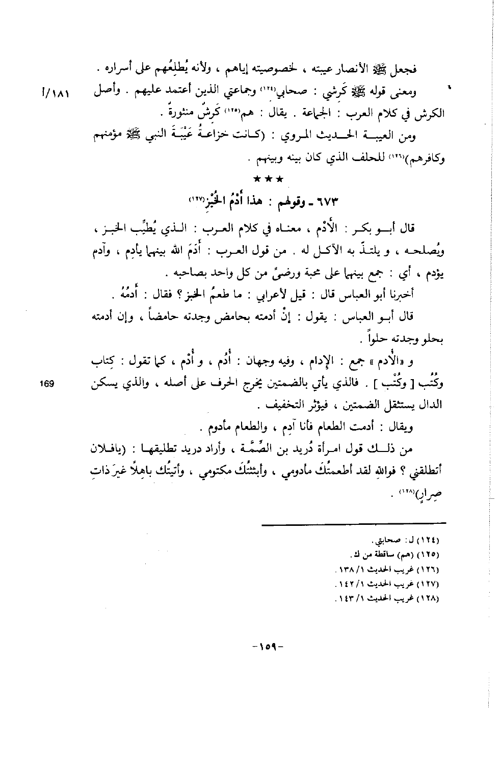 و" الأُدم " جمع: الإدام، وفيه وجهان: أُدُم، وأُدْم، كما تقول: كِتاب وكُتُب [وكُتْب] . فالذي يأتي بالضمتين يخرج الحرف على أصله، والذي يسكن (169) الدال يستثقل الضمتين، فيؤثر التخفيف.