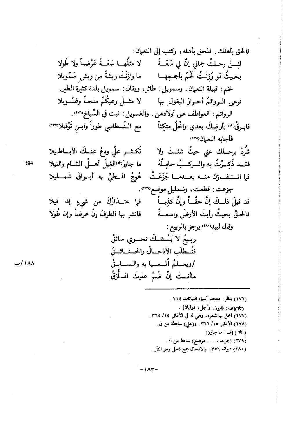 (فابرقْ بأرضِكَ بعدي واخْلُ متكِئاً ... مع النّطاسي طوراً وابنِ تَوْفيلا) (277)