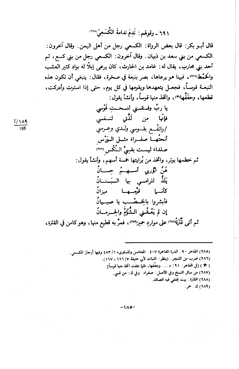 (285) الفاخر 90. الدرة الفاخرة 407. المحاسن والمساوىء 1 / 483 وفيها أرجاز الكسعي.