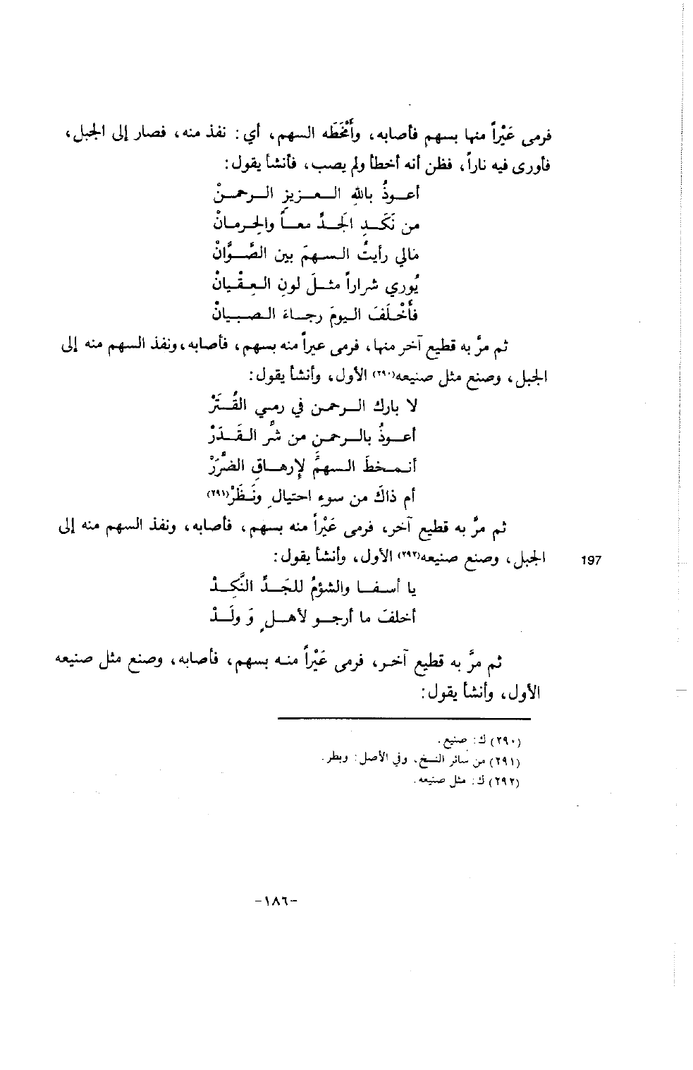 ثم مرَّ به قطيع آخر، فرمى عَيْراً منه بسهم، فأصابه، ونفذ السهم منه إلى (197) الجبل، وصنع صنيعة (292) الأول، وأنشأ يقول: