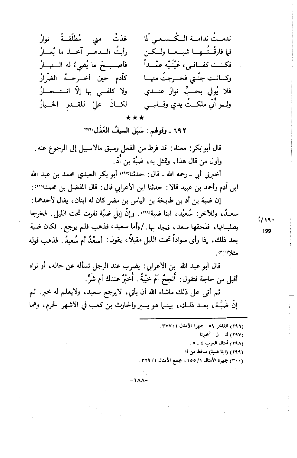 إن ضبة بن أد بن طابخة بن الياس بن مضر كان له ابنان، يقال لأحدهما: سعدٌ، وللآخر: سُعيْد، ابنا ضبة (299) . وإنّ إِبلَ ضبّة نفرت تحت الليل. فخرجا 190 / أيطلبانها، فلحقها سعد، فجاء بها. / وأما سعيد، فذهب فلم يرجع. فكان ضبة (199) بعد ذلك، إذا رأى سواداً تحت الليل مقبلاً، يقول: أسعْدٌ أم سُعيدٌ. فذهب قوله مثلا (300) .