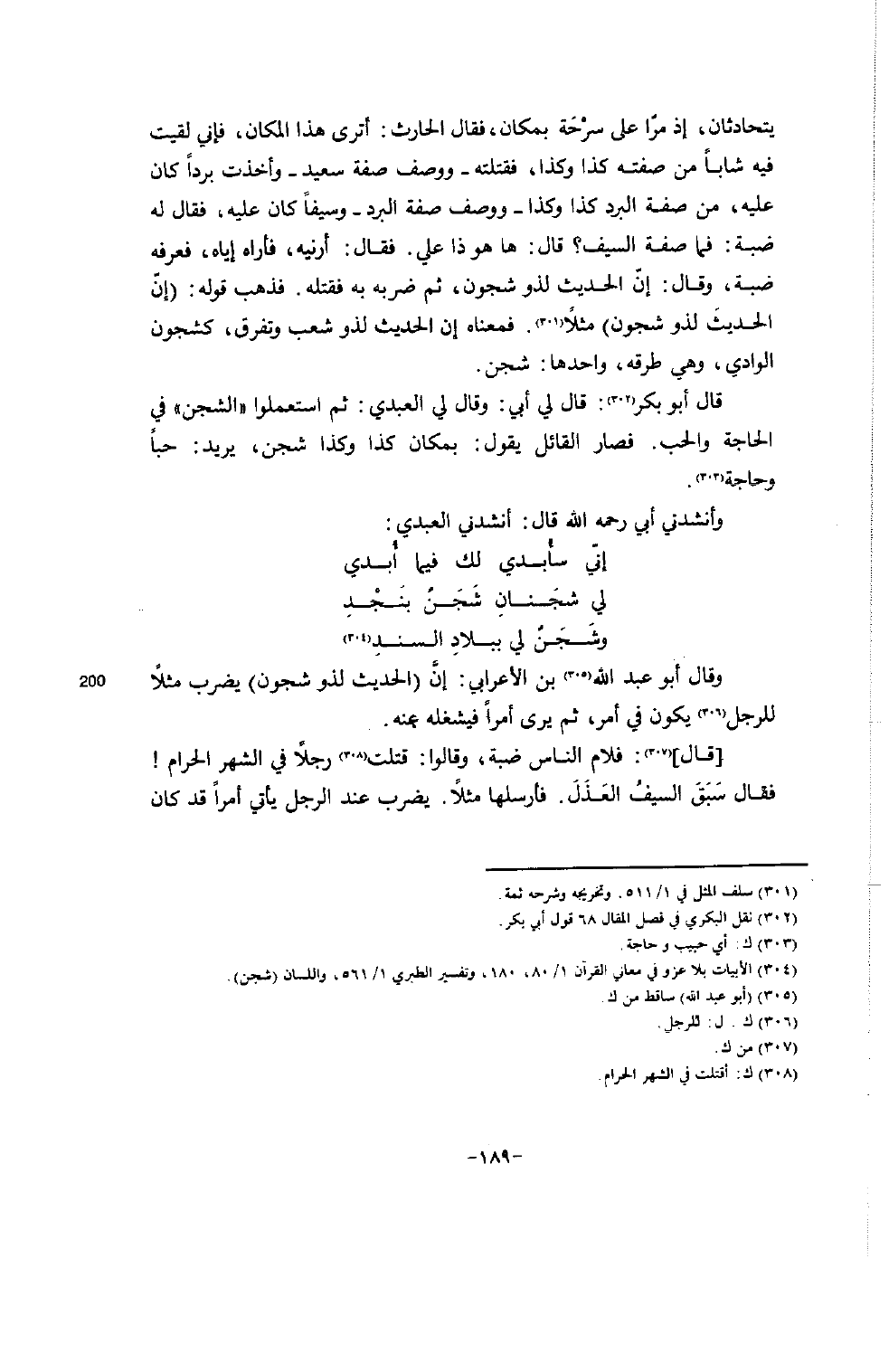 يتحادثان، إذ مرّا على سَرْحَة بمكان، فقال الحارث: أترى هذا المكان، فإني لقيت فيه شاباً من صفته كذا وكذا، فقتلته - ووصف صفة سعيد - وأخذت برداً كان عليه، من صفة البرد كذا وكذا - ووصف صفة البرد - وسيفاً كان عليه، فقال له ضبة: فما صفة السيف؟ قال: ها هو ذا علي. فقال: أرنيه، فأراه إياه، فعرفه ضبة، وقال: إنّ الحديث لذو شجون، ثم ضربه به فقتله. فذهب قوله: (إنّ الحديثَ لذو شجون) مثلاً (301) . فمعناه إن الحديث لذو شعب وتفرق، كشجون الوادي، وهي طرقه، واحدها: شجن.