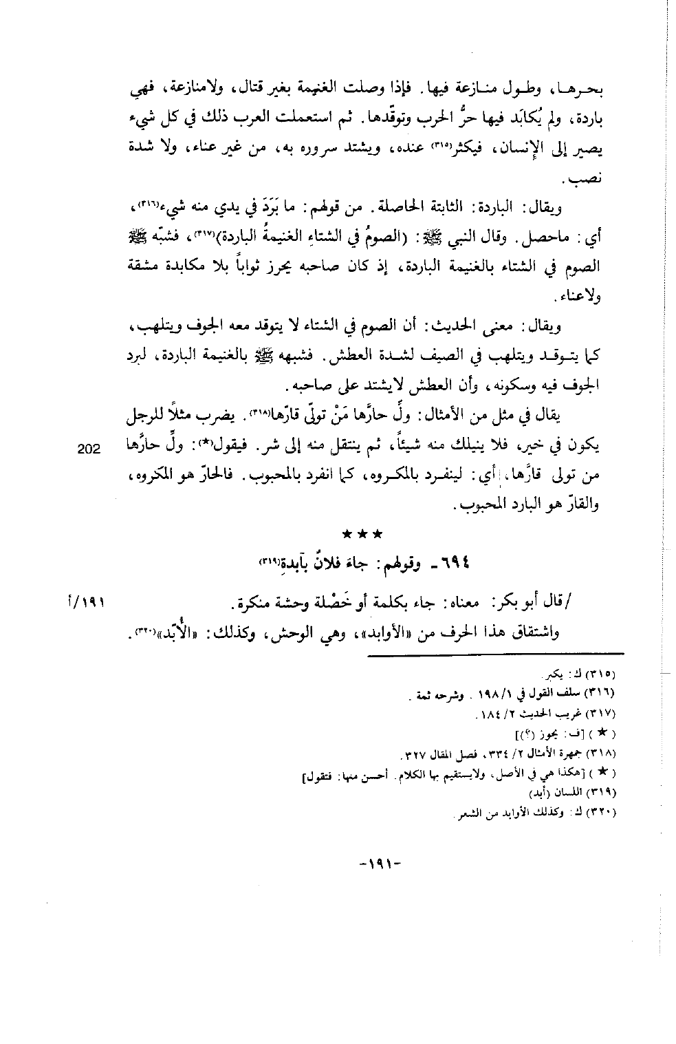 ويقال: الباردة: الثابتة الحاصلة. من قولهم: ما بَرَدَ في يدي منه شيء (316) ، أي: ما حصل: وقال النبي: (الصومُ في الشتاءِ الغنيمةُ الباردة) (317) ، فشبّه الصوم في الشتاء بالغنيمة الباردة، إذ كان صاحبه يحرز ثواباً بلا مكابدة مشقة ولا عناء.