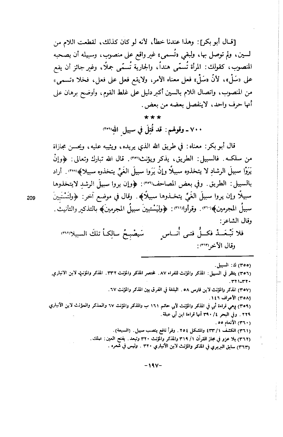 قال أبو بكر: معناه: في طريق الله الذي يريده، ويثيبه عليه، ويحسن مجازاة من سلكه. فالسبيل: الطريق، يذكر ويؤنث (357) . قال الله تبارك وتعالى: {وإنْ يَرَوْا سبيبلَ الرشادِ لا يتخذوه سبيبلاً وإنْ يَرَوا سبيلَ الغيِّ يتخذوه سبيلا} (358) . أراد بالسبيل: الطريق. وفي بعض المصاحف (359) : {وإن يروا سبيلَ الرشدِ لا يتخذوها سبيلاً وإن يروا سبيلَ الغَيِّ يتخذوها سبيلاً} . وقال في موضع آخر: (ولتَسْتَبِينَ (209) سبيلُ المجرمين) (360) . وقرأوا (361) : {وليَسْتبينَ سبيلُ المجرمينَ} بالتذكير والتأنيث.