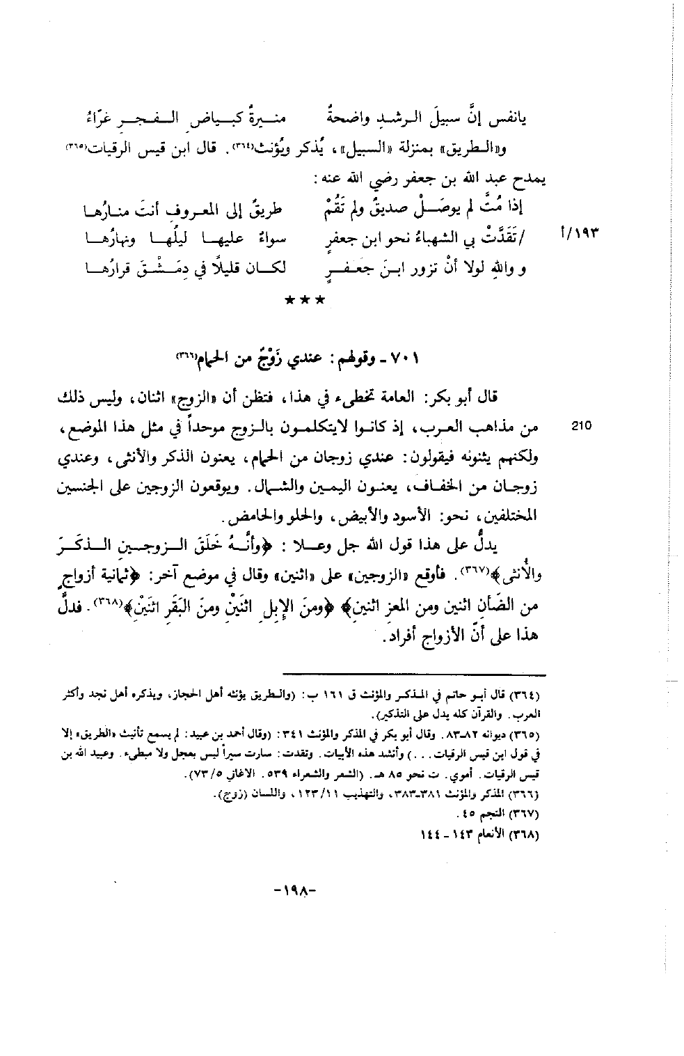 و" الطريق: بمنزلة " السبيل "، يُذكر ويُؤنث (364) . قال ابن قيس الرقيات (365) يمدح عبد الله بن جعفر رضي الله عنه: