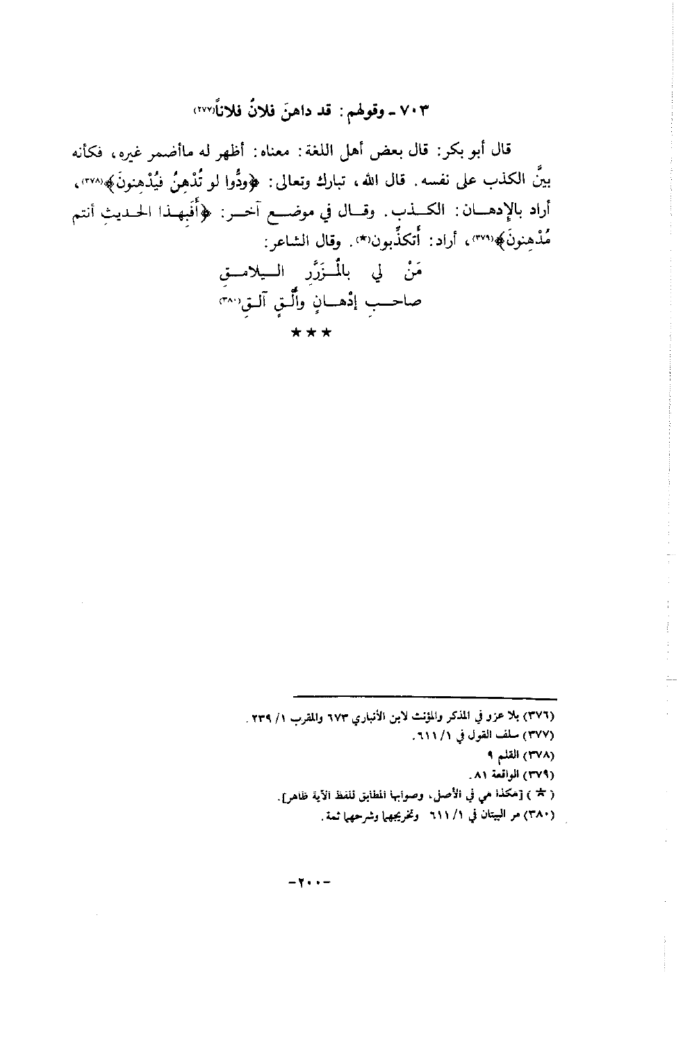 قال أبو بكر: قال بعض أهل اللغة: معناه: أظهر له ما أضمر غيره، فكأنه بيَّن الكذب على نفسه. قال الله، تبارك وتعالى: {ودُّوا لو تُدْهِنُ فيُدْهِنونَ} (378) ، أراد بالإِدهان: الكذب. وقال في موضع آخر: {أَفَبِهذا الحديثِ أنتم مُدْهِنونَ} (379) ، أراد: أَتكذِّبون. وقال الشاعر: