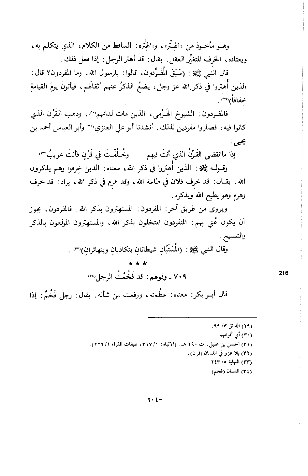 فالمفردون: الشيوخ الهَرْمى، الذين مات لداتهم (30) ، وذهب القَرْن الذي كانوا فيه، فصاروا مفردين لذلك. أنشدنا أبو علي العنزي (31) وأبو العباس أحمد بن يحيى: