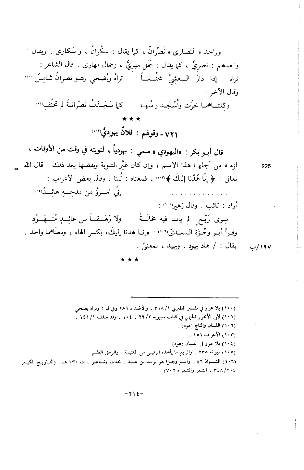 قال أبو بكر: " اليهودي " سمي: يهودياً، لتوبته في وقت من الأوقات، (226) لزمه من أجلها هذا الاسم، وإن كان غيَّر التوبة ونقضها بعد ذلك. قال الله تعالى: {إنّا هُدْنا إليكَ} (103) ، فمعناه: تُبنا. وقال بعض الأعراب:
