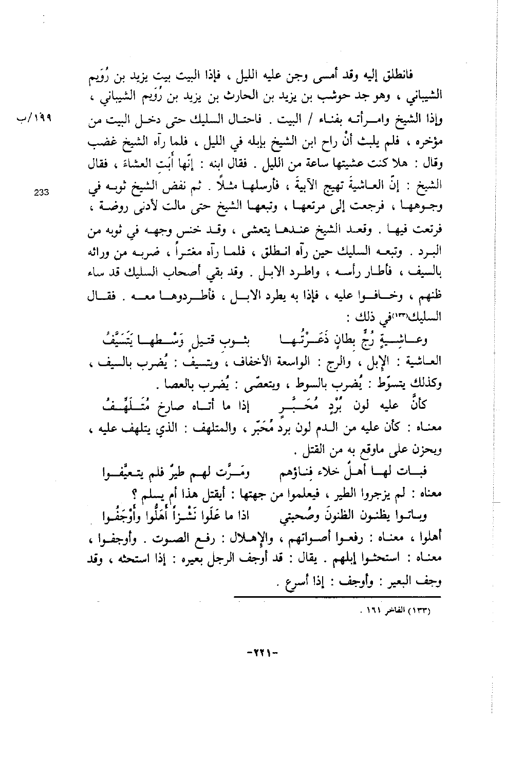 فانطلق إليه وقد أمسى وجن عليه الليل، فإذا البيت بيت يزيد بن رُوَيم الشيباني، وهو جد حوشب بن يزيد بن الحارث بن يزيد بن رُوَيم الشيباني، وإذا الشيخ وامرأته بفناء / البيت. فاحتال السليك حتى دخل البيت من 199 / ب مؤخره، فلم يلبث أنْ راح ابن الشيخ بإبله في الليل، فلما رآه الشيخ غضب وقال: هلا كنت عشيتها ساعة من الليل. فقال ابنه: إنّها أَبَتِ العشاءَ، فقال الشيخ: إنّ العاشيةَ تهيج الآبيةَ، فأرسلها مثلاً. ثم نفض الشيخ ثوبه في (233) وجوهها، فرجعت إلى مرتعها، وتبعها الشيخ حتى مالت لأدنى روضة، فرتعت فيها. وقعد الشيخ عندها يتعشى، وقد خنس وجهه في ثوبه من البرد. وتبعه السليك حين رآه انطلق، فلما رآه مغتراً، ضربه من ورائه بالسيف، فأطار رأسه، واطرد الإبل. وقد بقي أصحاب السليك قد ساء ظنهم، وخافوا عليه، فإذا به يطرد الإبل، فأطردوها معه. فقال السليك (133) في ذلك: