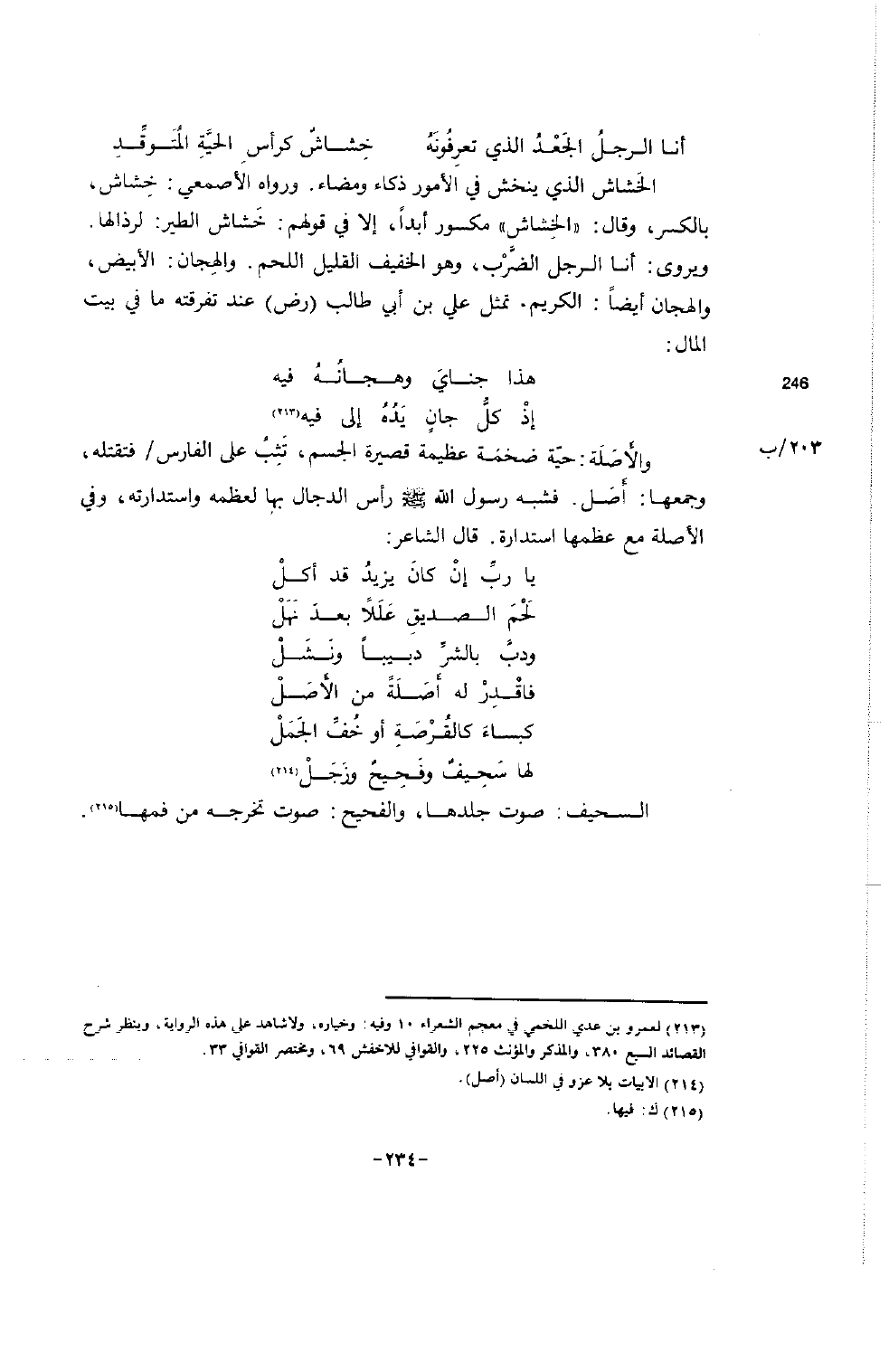 الخَشاش الذي ينخش في الأمور ذكاء ومضاء. ورواه الأصمعي: خِشاش، بالكسر، وقال: " الخِشاش " مكسور أبداً، إلا في قولهم: خَشاش الطير: لرذالها. ويروى: أنا الرجل الضرَّبْ، وهو الخفيف القليل اللحم. والهِجان: الأبيض، والهجان أيضاً: الكريم. تمثل علي بن أبي طالب (رض) عند تفرقته ما في بيت المال: (246)