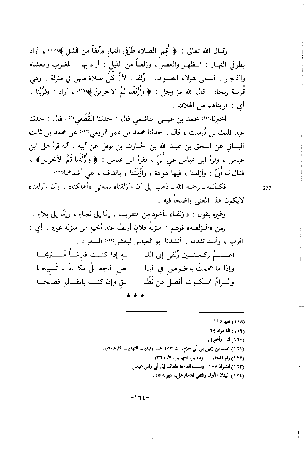 وقال الله تعالى: {أَقِمِ الصلاةَ طَرَفَي النهارِ وزُلَفاً من الليل} (118) ، أراد بطرفي النهار: الظهر والعصر، وزلفاً من الليل: أراد بها: المغرب والعشاء والفجر. فسمى هؤلاء الصلوات: زُلَفاً، لأنّ كُلَّ صلاة منهن في منزلة، وهي قُربة ونجاة. قال الله عز وجل: {وأزْلَفْنا ثَمَّ الآخرينَ} (119) ، أراد: وقرَّبْنا، أي: قربناهم من الهلاك.