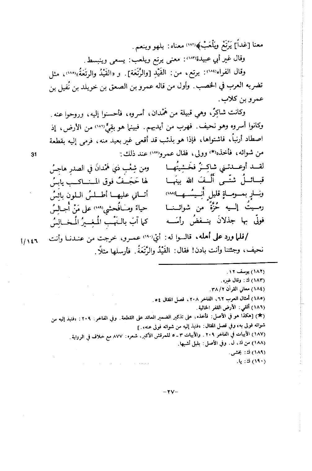 وكانت شاكِرٌ، وهي قبيلة من هَمْدان، أسروه، فأحسنوا إليه، وروحوا عنه. وكانوا أسروه وهو نحيف. فهرب من أيديهم. فبينما هو بقِيٍّ (186) من الأرض، إذ اصطاد أرنباً، فاشتواها، فإذا هو بذئب قد أقعى غير بعيد منه، فرمى إليه بقطعة من شوائه، فأخذه وولى، فقال عمرو (187) عند ذلك: (31)