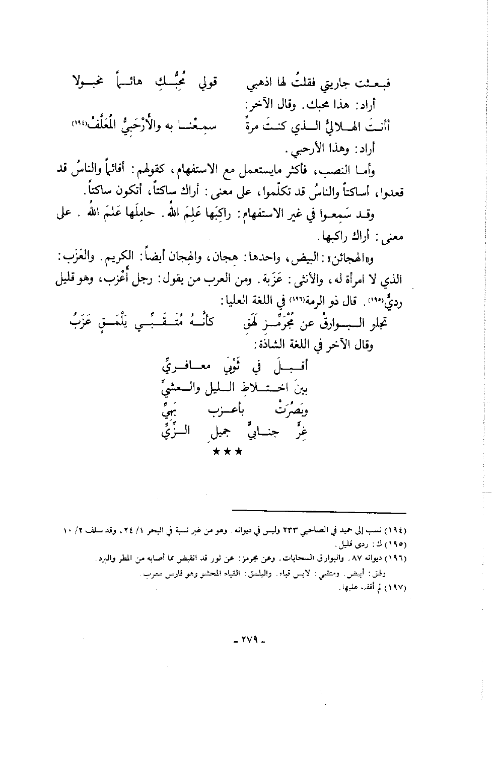 و" الهجائن ": البيض، واحدها: هِجان، والهِجان أيضاً: الكريم. والعَزَب: الذي لا امرأة له، والأنثى: عَزَبة. ومن العرب من يقول: رجل أَعْزب، وهو قليل رديٌّ (195) . قال ذو الرمة (196) في اللغة العليا: