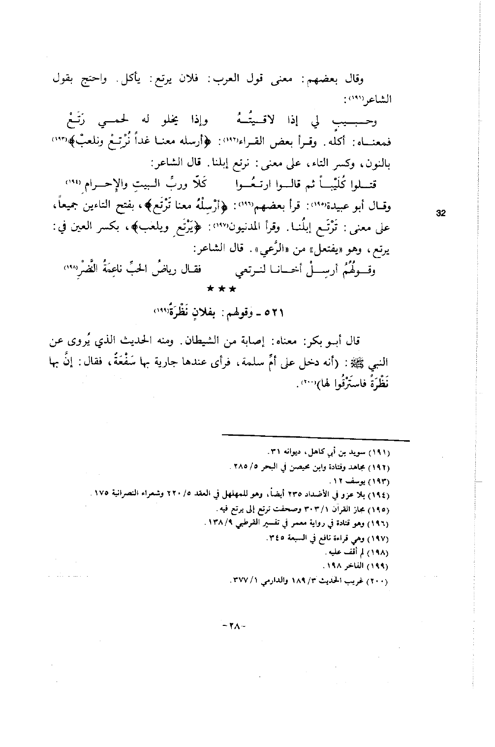 فمعناه: أكله. وقرأ بعض القراء (192) : {أرسله معنا غداً نُرْتِعْ ونلعبْ} (193) بالنون، وكسر التاء، على معنى: نرتع إبلنا. قال الشاعر: