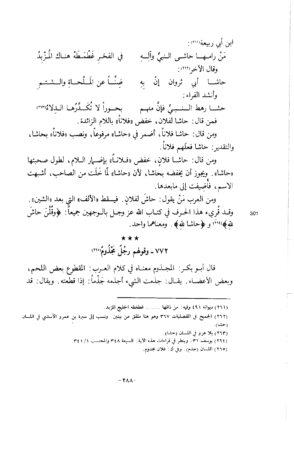 ومن العرب مَنْ يقول: حاشَ لفلانٍ. فيسقط " الألف " التي بعد " الشين ". (301) وقد قُرِيء هذا الحرف في كتاب الله عز وجل بالوجهين جميعاً: {وقُلْنَ حاشَ للهِ} (264) و {حاشا للهِ} . ومعناهما واحد.