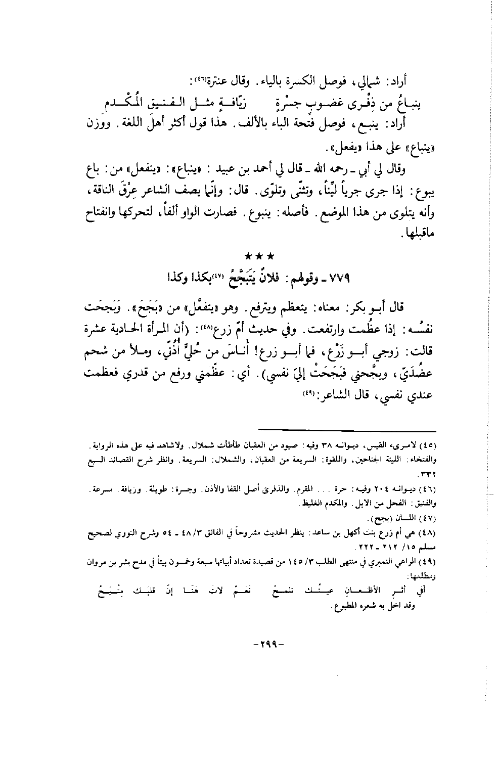 وقال لي أبي - رحمه الله - قال لي أحمد بن عبيد: " ينباع ": " ينفعل " من: باع يبوع: إذا جرى جرياً ليِّناً، وتثّنى وتلوّى. قال: وإنّما يصف الشاعر عِرْقَ الناقة، وأنه يتلوى من هذا الموضع. فأصله: ينبوع. فصارت الوالو ألفاً، لتحركها وانفتاح ما قبلها.