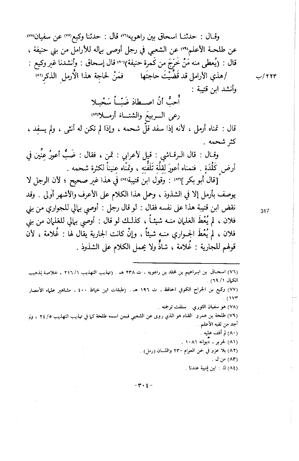 وقال: حدثنا إسحاق بن راهويه (76) قال: حدثنا وكيع (77) عن سفيان (78) عن طلحة الأعلم (79) عن الشعبي في رجل أوصى بماله للأرامل من بني حنيفة، قال: (يعطى منه مَنْ خَرَجَ من كَمرِة حنيفة) (80) قال إسحاق: وأنشدنا غير وكيع: 223 / ب