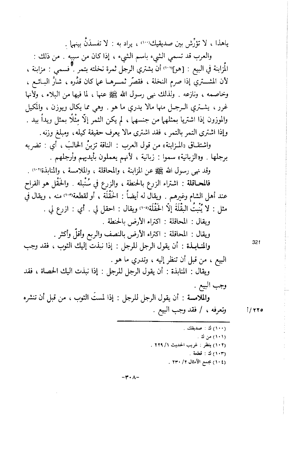 وقد نهى رسول الله عن المزابنة، والمحاقلة، والملامسة، والمنابذة (102) .